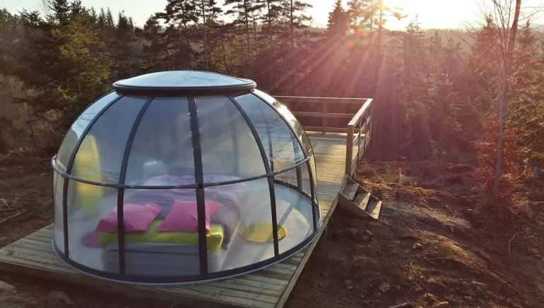 Le dôme étoile est un dôme entièrement transparent et immergé dans la Nature qui permettra de profiter des belles nuits étoilées grâce au lit chauffant.
