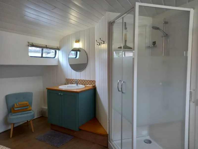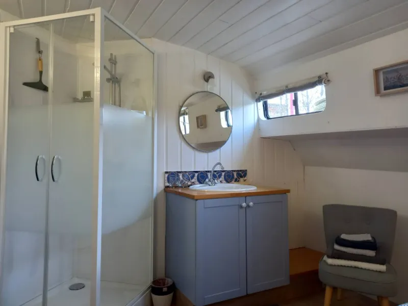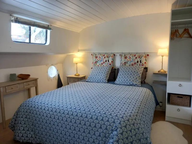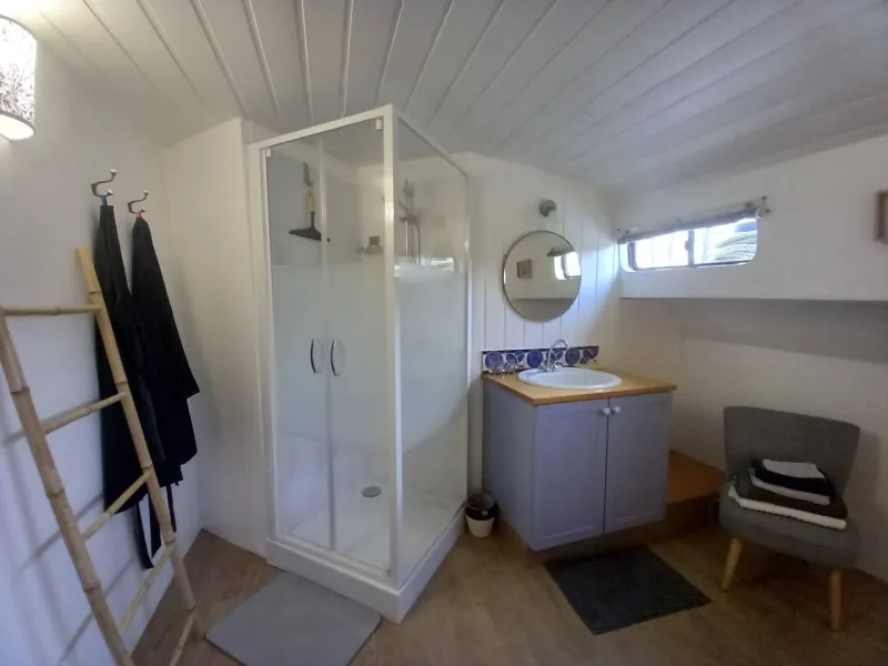 La Cabine Bleue (14 m²) comprenant 1 lit 160x200 modulable en 2 lits 80x200, une penderie, un coffre de rangement, cabine de douche, lavabo et climatisation. WC à l'extérieur de la cabine à l'usage unique des occupants de la cabine Bleue.