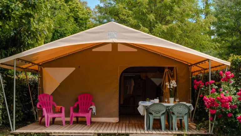 2 chambres totalement séparées : 1 lit 140x190, chevet et lampe. La seconde avec 2 lits superposés 80x190 et 1 lit 70x140 le tout avec sommiers, alèses, oreillers et couvertures, rangement. utilisation des sanitaires du camping.