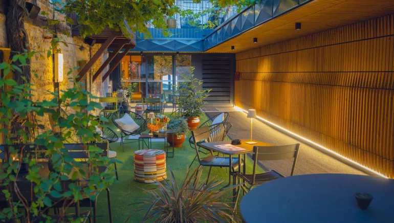 Élégants espaces communs : salon détente avec un billard, bar et terrasse dans la cour intérieure.