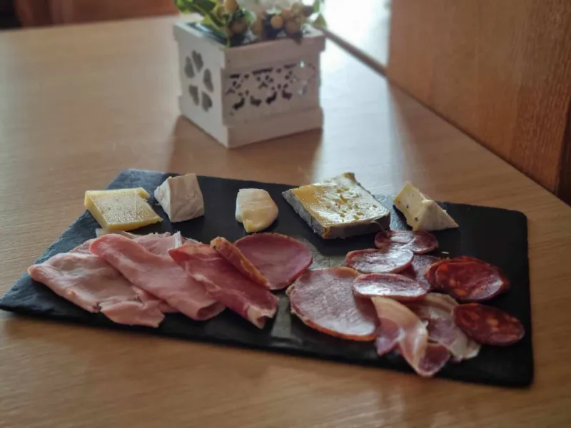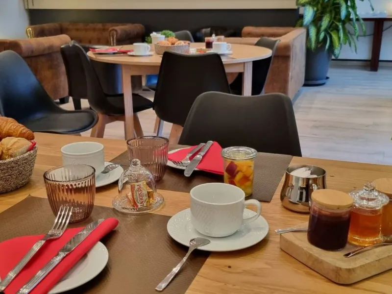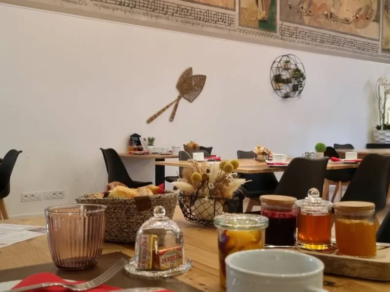 Petit-déjeuner servi en salle : gourmand et fait maison, déclinaison d'œufs, assiette charcuterie, fromages de pays, salade de fruits frais, compote, confitures maison, biscuits et pâtisseries ou brioches maison, jus de fruits et fruits pressés.