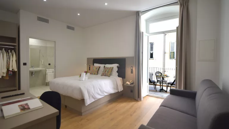 Son ascenseur de verre dessert 34 chambres spacieuses et 11 appartements conçus pour offrir un séjour confortable aux voyageurs. Élégantes et chaleureuses, les chambres sont également entièrement équipées : salle de bain privative avec douche, sèche-cheveux, grands téléviseurs, Wi-Fi, literie de qualité, coffre-fort, des chambres familiales disposent d’une terrasse. L’hôtel propose un petit déjeuner express en terrasse et, dans une salle dédiée, un buffet continental. Les clients apprécieront particulièrement la fraîcheur de la salle de petit-déjeuner voutée pleine de charme.