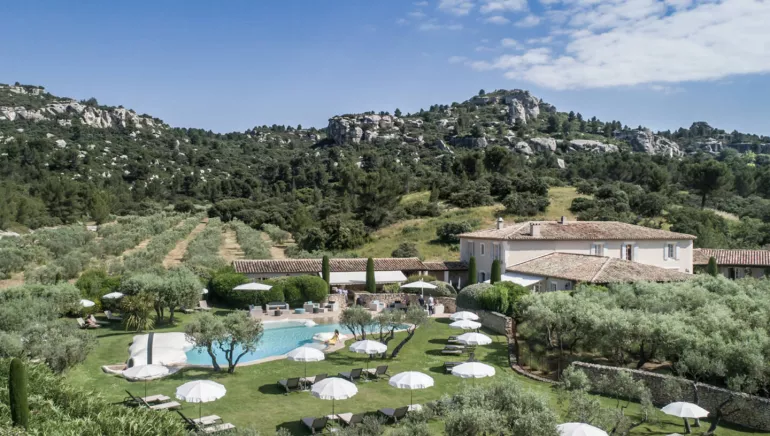 Au cœur d’une oliveraie, demeure provençale à la décoration discrète et raffinée, à 2 km du village des Baux-de-Provence. Dépaysement total avec l’étonnante piscine paysagée, ses rochers, sa plage immergée et son spa intégré. Assiettes gourmandes servies le midi autour de la piscine.