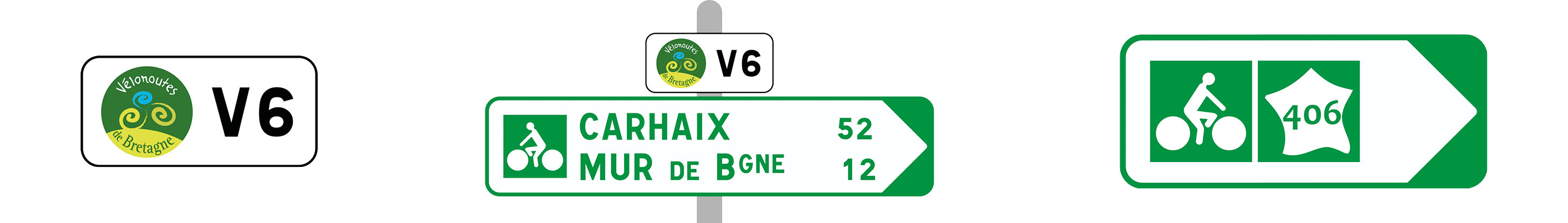 La Voie 406 Bretagne de Carhaix à St-Méen-le-Grand est entièrement balisée dans les deux sens de l'ouest à l'est. Vous pouvez également trouver des panneaux portant l'indication V6.