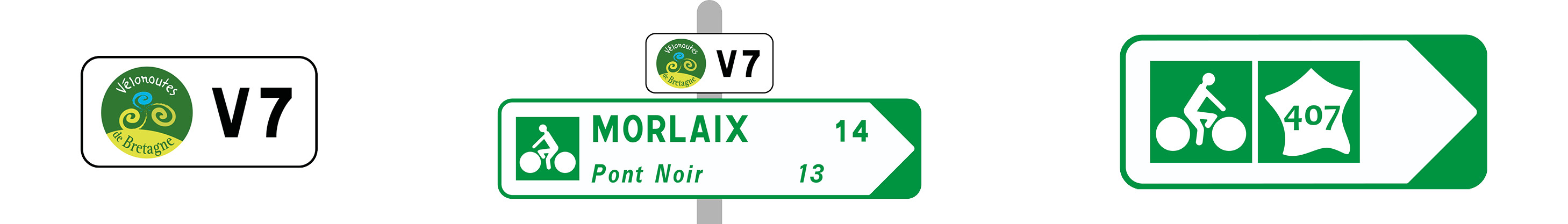 La Voie 407 Bretagne de Roscoff à Concarneau est entièrement balisée dans les deux sens, du nord au sud. Son identifiant régional V407 est indiqué sur les panneaux.Vous pouvez également encore trouver parfois des panneaux portant l'indication V7. Entre Roscoff et Port-de-Carhaix, l'itinéraire fait route commune avec La Vélodyssée.