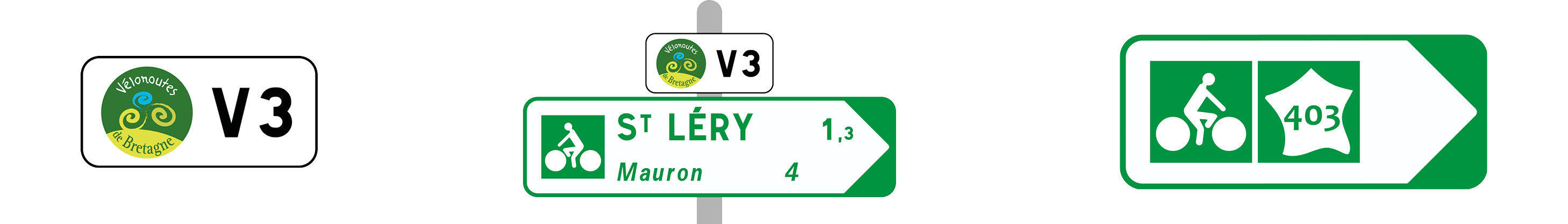 La Voie 3 Bretagne de Saint-Malo à la presqu'île de Rhuys à vélo est entièrement balisée dans les deux sens du nord au sud. Son identifiant régional V403 est progressivement indiqué sur les panneaux. Vous pouvez parfois trouver des panneaux portant l'indication V3.