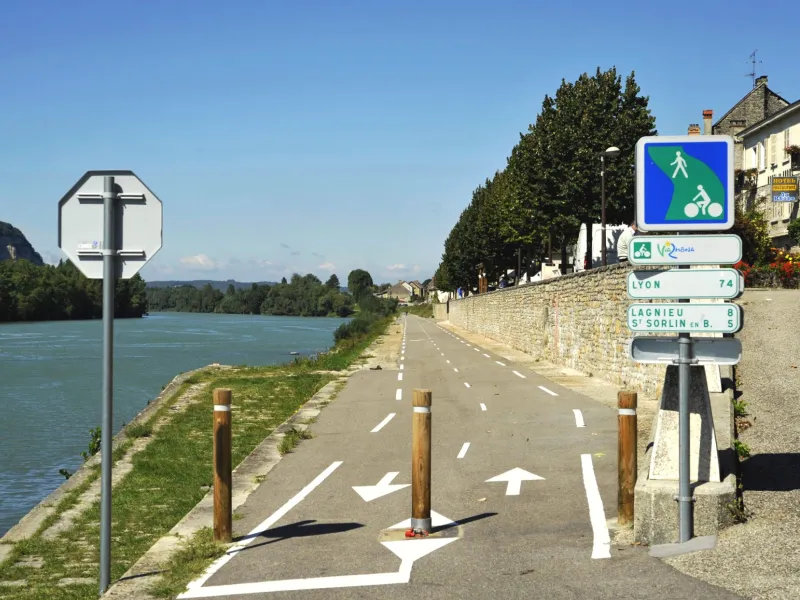 Vous entrez sur les Balcons du Dauphiné par le pont de Grolée. Après avoir fait le tour du village de Brangues et son château (et profité du superbe panorama), vous rejoignez la voie verte le long de la Route de Groslée. Points de vigilance car l’arrivée dans Morestel se fait sur une courte portion de voie partagée. À Morestel, deux options s’offrent à vous : vous pouvez contourner la ville par la Voie Verte, ou passer en centre-ville, chauffer un tout petit peu vos mollets pour profiter de la vieille ville et de tous ses commerces et restaurants. Pour la suite du voyage, vous quittez Morestel par une voie verte et de tout petits chemins ombragés qui vous amèneront vers les Étangs de la Serre et son espace pique-nique parfait pour une pause. Par la suite, vous continuez sur une voie verte très ombragée et fraîche jusqu’à Quirieu, pour arriver par la, suite à La Vallée Bleue et toute son offre de loisirs et restaurants. Ensuite, vous allez vous diriger vers Sault-Brénaz par l’Isle de la Serre, et la voie verte vous emmènera dans l’Ain jusqu’au Pont de Lagnieu. Attention à cet endroit car le trottoir n’est pas très large et vous serez amené à croiser des voitures. La suite est une voie verte jusqu’au village de La Balme les Grottes.