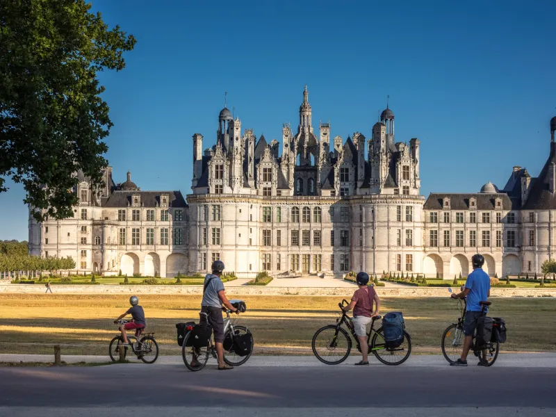 Chef d'oeuvre de la Renaissance inscrit au patrimoine mondial de l'Unesco, le château de Chambord, XVIe s., est l'un des sites les plus visités du Val de Loire. Domaine royal de François Ier, d'inspiration féodale et italienne, il aurait été dessiné par Léonard de Vinci. Le fameux escalier à double révolution ainsi que 440 pièces caractérisent ce joyau entouré d'un parc clos de 5 440 ha, réserve nationale cynégétique. Garage à vélos sécurisé pour vos montures.