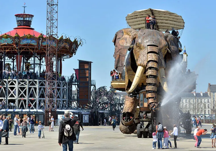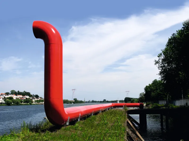Sans y prêter attention, on ne pourrait voir qu'un simple tube rouge. Mais au fur à mesure que le regard s'attarde sur l'autre rive, c'est un étrange animal "industriel" qui semble sortir du fleuve. Serpent des mers ou dragon de plus de 40 mètres de long, il surgit sur l'estacade et se dresse face à la Loire "gueule ouverte". Jimmie Durham (1940-2021) artiste d'origine Cherokee, transforme des objets communs, trouvés ou rejetés, en êtres mystérieux qui deviennent source de curiosité et d'investigations, indices de mondes imaginaires.