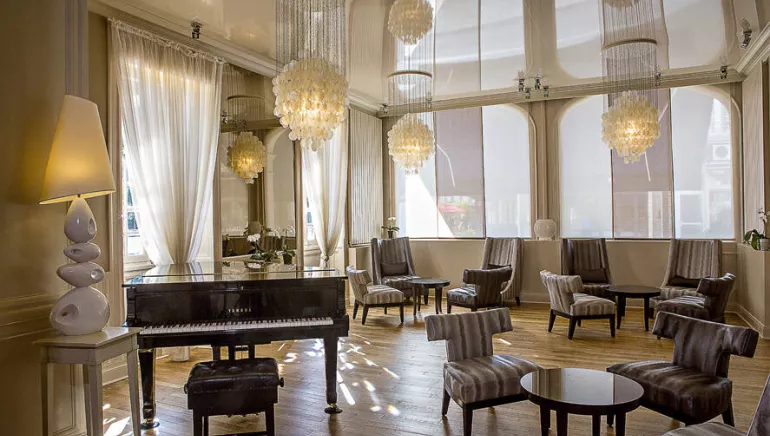 Le salon Gerbert avec son piano est un lieu calme, discret et idéal pour vos rendez-vous, entretiens, ou moments de détente.