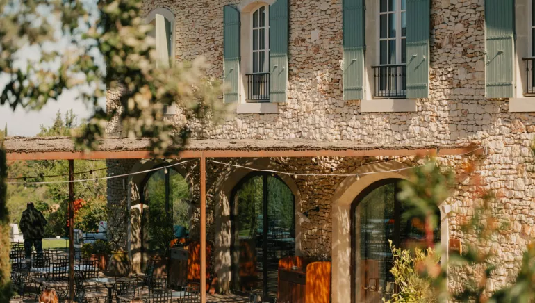 Le bar, ouvert toute la journée, est un lieu de rencontre où l’on savoure cocktails maison, vins locaux et boissons rafraîchissantes. À l’heure de l’apéritif, le spectacle du coucher de soleil face au village accompagne les premières bouchées, parmi lesquelles se distinguent la pizza à la truffe et d’autres délicieuses mises en bouche. C’est le moment idéal pour se détendre, partager un instant de convivialité et admirer la lumière dorée du Luberon.