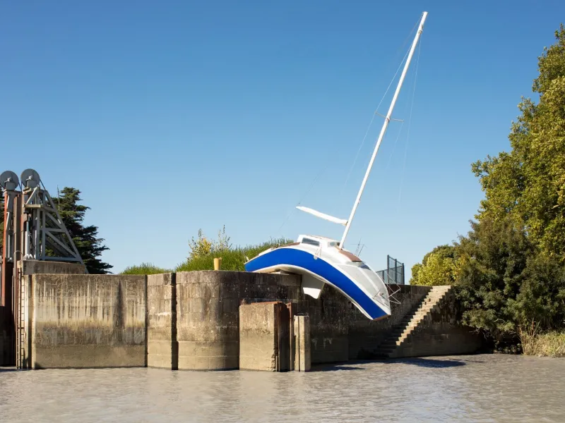 Arrivée par hasard à la sculpture, Erwin Wurm aime à en défier les règles et les habitudes. Empreintes d'un dramatique humour, son oeuvre fait basculer des moments ordinaires dans un univers absurde. Pour l'artiste, les objets comme les hommes sont soumis aux forces de la pensée. Ce voilier et se penche et se plie, comme irrésistiblement attiré par le fleuve. Les objets ont ils une âme ? Erwin Wurm répond "oui" avec un point d'exclamation !