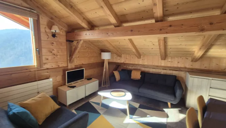1 pièce de vie de 30m² avec cuisine toute équipée (plaques induction, four, lave-vaisselle, cafetière traditionnelle et à capsules dolce gusto, ...) ouvert sur le salon en partie mansardée avec terrasse exposée plein sud et magnifique vue dégagée sur les montagnes.