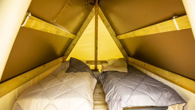 La tente Trek Duo est pensée pour proposer une expérience en tente équipée avec le charme d’un lodge au plancher bois et le minimum de confort : petite terrasse couverte avec table pique-nique et coin cuisine, branchement électrique individuel.